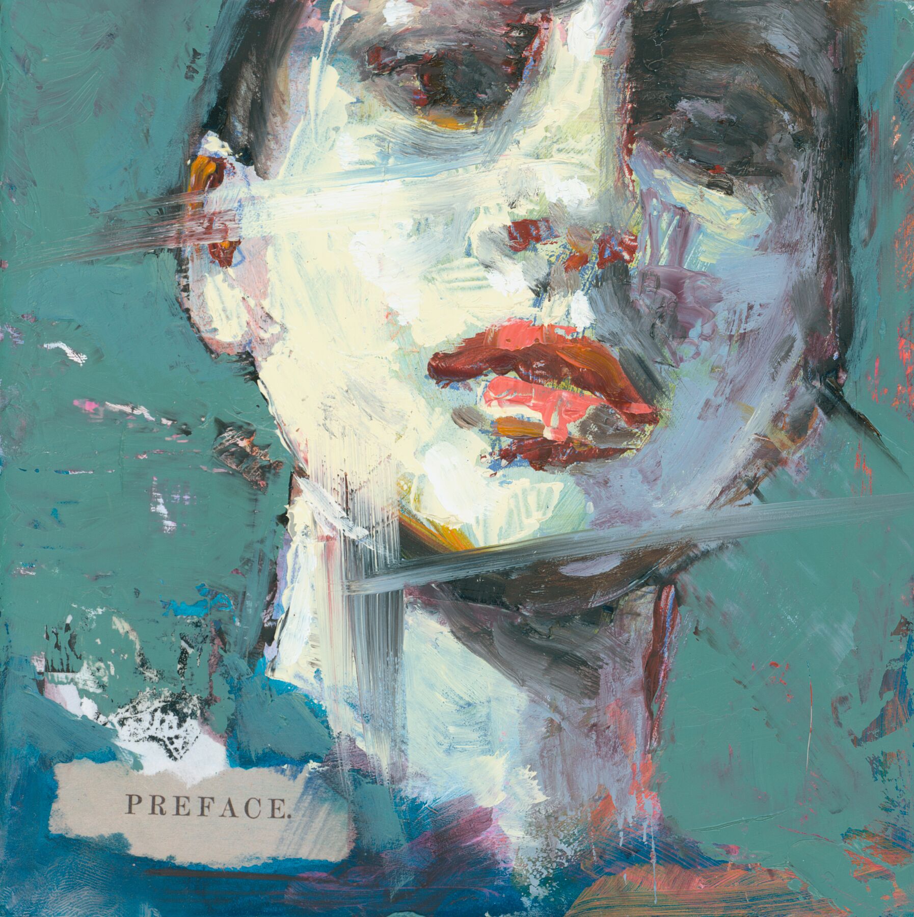 Reproduction print of a mixed-media portrait in oil paints, with text ‘PREFACE’. This print is perfect as a gift or to add to your own collection with its depiction a woman expressively and vibrantly painted.