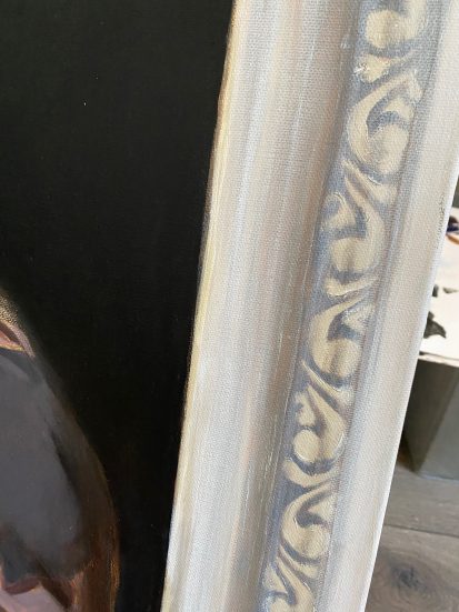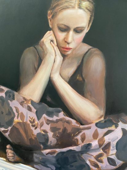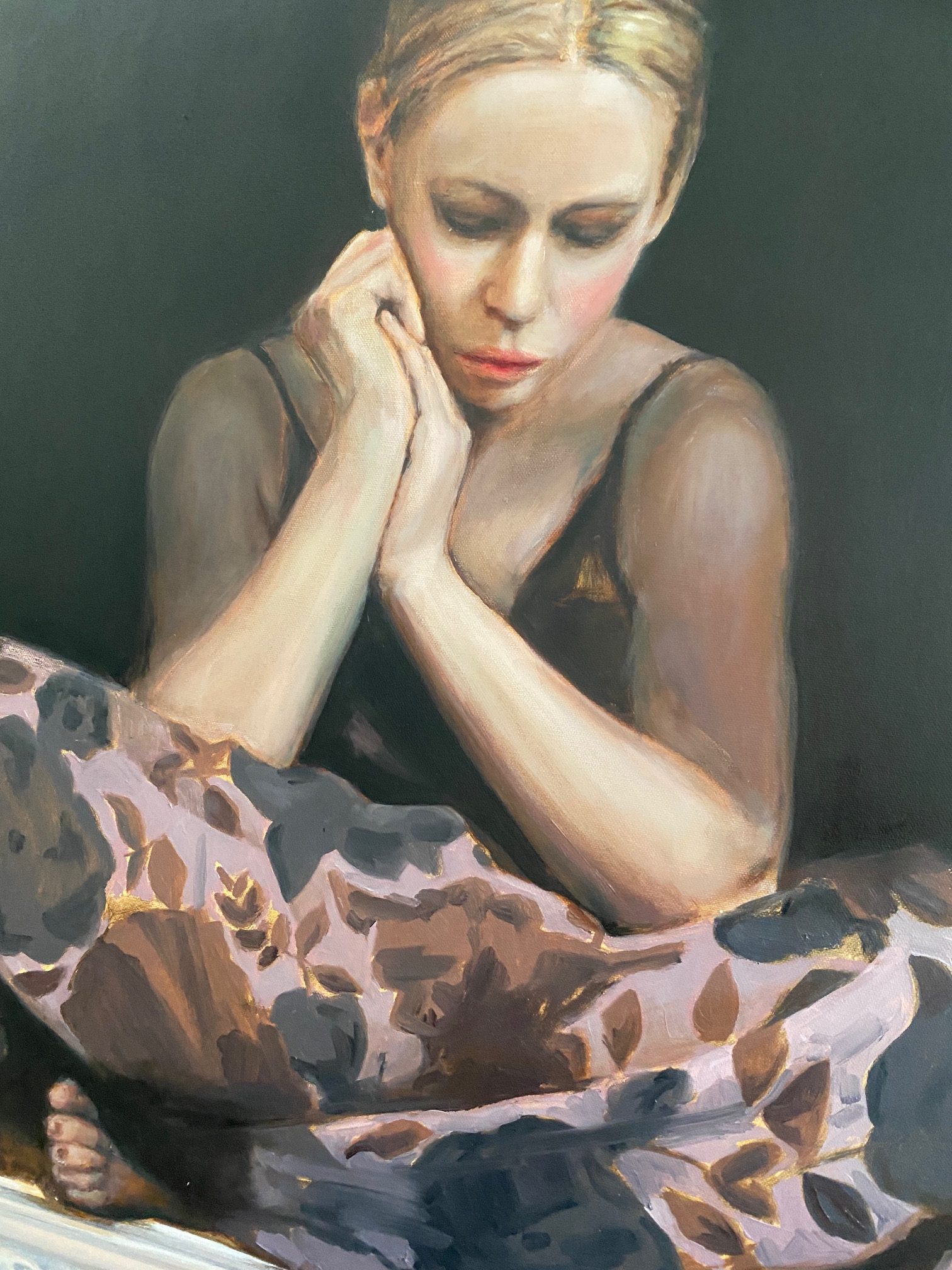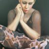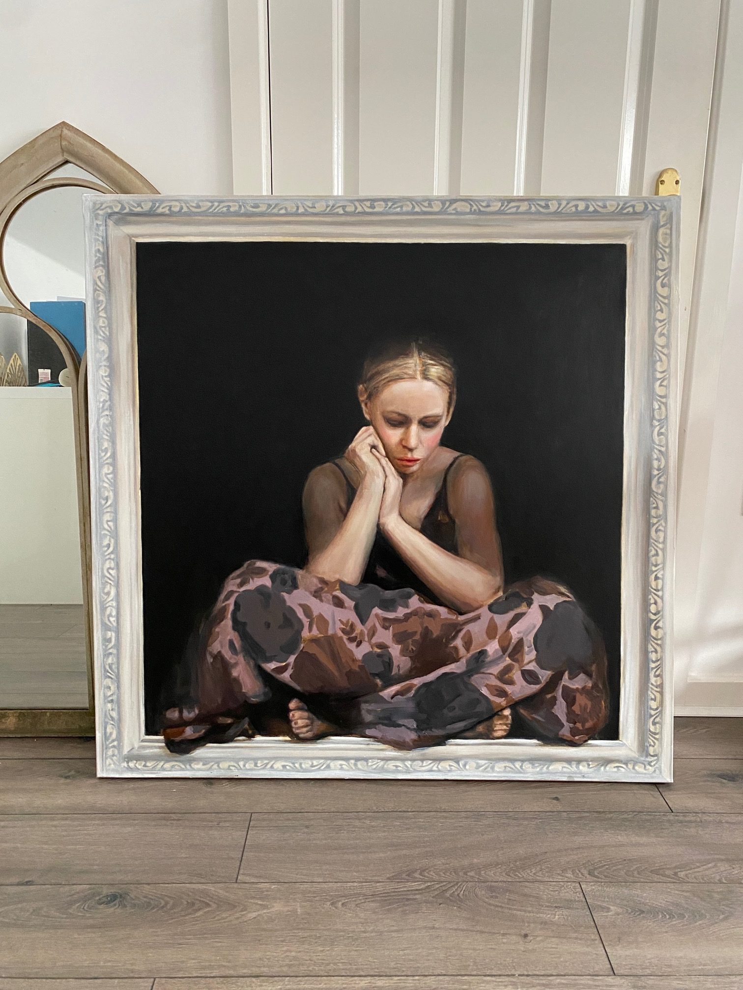 This figurative painting, Quiet Within, captures a figure seated in quiet introspection, her body folded inward as though retreating into her own thoughts. Against a stark black background, the skin and contemplative expression are highlighted, creating a powerful sense of stillness.
